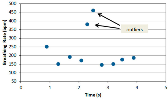 The normal breathing rate in relaxed mice usually ranges from 80 to 230 breaths per minute. Figure 8 shows that most of the points were in the range of 160–180 breaths per minute, but there were two points the frequency of which was much higher (outliers). This might have been produced by the mouse sniffing or moving.