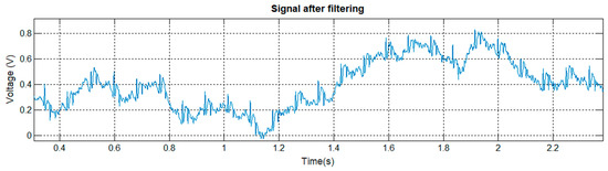 There is a slight variation in the signal of Figure 7b, the rhythm of which, given its frequency, may suggest a mouse respiratory signal. By eliminating the variation of the midline and filtering the signal using a low-pass filter (first-order cutoff frequency 80 Hz), we obtained a lower-frequency signal that could be the breathing rate of the mouse. In order to confirm this hypothesis, we proceeded to calculate its estimated breathing rate, which is displayed in Figure 8.