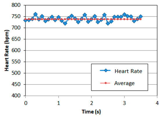 Processing the signal shown in Figure 9, the instantaneous heart rate could be calculated from the time elapsed between any two consecutive events. The drawback of this method is that the calculated value may differ from the measured value due to variations in heart rate associated with breathing (known as respiratory sinus arrhythmia). Applying this method, we obtained the result shown in Figure 10, which shows a very regular pattern with an average value of 738 beats per minute. The typical heart rate in mice ranges from 310 to 840 beats per minute.
