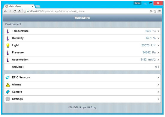 Other menus were prepared to visualize the information collected by the matrix of EPIC sensors (the value of the BR and its variability), alarms, and webcam images. openHAB received information from the sensors through the microcontroller SAM3X8E, which was responsible for the initialization and control of the sensors through a program developed in Arduino code. This program analyzed openHAB requests and sent responses appropriately. For example, at a request for the current temperature value, the system first prepares the sensor, acquires the temperature value, and sends this value to the application in openHAB. This communication was carried out using three code parameters: