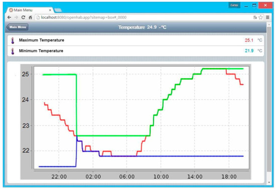 From the main menu, each of the monitored parameters can be accessed showing its current value: temperature, humidity, light intensity, pressure, and acceleration. By selecting one of them, current, maximum, and minimum values of that parameter are displayed as a graph, showing its temporal variation. Figure 12 shows the exemplary variation of temperature inside the transport box.