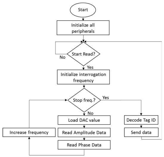 Figure 3 shows how the firmware in the microprocessor is developed to implement the interrogation/detection algorithm. The firmware in the microprocessor starts by loading the DAC with a 12-bit digital number corresponding to the necessary analog tuning voltage for the VCO. After setting this value, the firmware reads data from the ADC, where these data are the digital values of the analog signal created by the Phase Gain Detector when comparing the received signal from the tag to the reference signal. The reader stops interrogation until it reaches the final frequency sample, and it then displays frequency domain behavior.