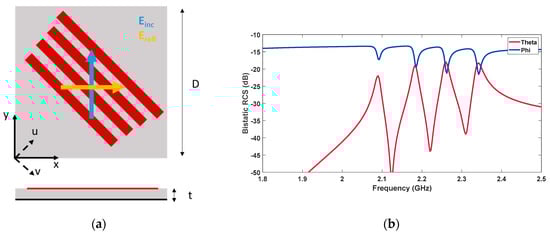 The conditions in (3) are met at the resonance frequency of the dipole-ground plane structure where the reflection coefficient along the dipole (Ru) is characterized by a phase crossing the zero, and the reflection coefficient orthogonal to the dipole (Rv) is characterized by a phase of 180°. In order to guarantee that the Ru and Rv needs to be equal or very close to 1, a dielectric substrate with a very low tangent loss is required. For this reason, a Rohacell spacer is used. The frequency response of the investigated structure has initially been analyzed as an infinitely periodic one for assessing the effect of the resonators by using a Periodic Method of Moments (PMoM) []. Afterwards, a simulation of the single unit cell was carried out by Ansys HFSS v.18. Both the co-polar and cross-polar RCS of the tag is reported in Figure 4b.