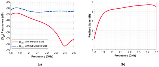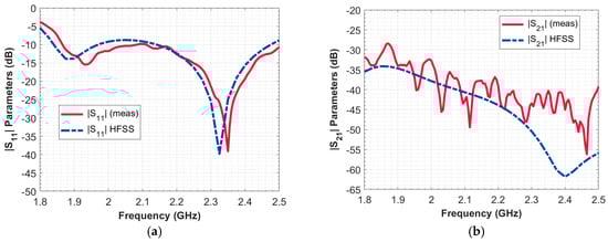 The designed tag encodes data into the frequency spectrum by resorting to resonant structures. The resonant structure operates in the (1.9–2.5) GHz Band. The design encodes the information in the cross-polar scattering as the tag is also working on metallic objects []. A typical drawback of frequency domain tag is the need of a large spectrum for data encoding. In order to obtain reliable RCS measurements, wideband and compact wideband antennas need to be designed. The main objectives of the project have therefore been to guarantee, in the whole band in which the tag information is encoded, a high level of gain and, at the same time, a very low level of coupling between the two antennas (i.e., low value of the scattering parameter). The overall system, as shown in Figure 5, consists of two radiating elements, namely two wideband E-Shaped Antennas printed on a 0.2 mm thick FR4 substrate and placed at a distance of 15 mm from the ground plane []. The aim of the project has also been to optimize the size of the radiators in order to obtain a compact structure. The configuration consists of two orthogonal antennas, one transmitting and one receiving, with both operating in linear polarization, in order to reliably retrieve the cross-polar component backscattered from the tag when it is interrogated. In this way, it is possible to distinguish the RCS of the cross-polar component of the tag from that of the clutter in the real scenario, because the latter has a dominant frequency response in the co-polar component. To achieve this goal, or at least to ensure an isolation between −30 dB and −50 dB in the analyzed frequency range, the distance at which the two antennas can be positioned on the FR4 substrate was numerically optimized using Ansys HFSS software. In addition, once this optimal distance was found, to provide a further lowering of , a structure consisting of a thin metallic slab was introduced and suitably dimensioned. As evidence of this point, the curves of are shown in Figure 6 and overlapped in two different cases: The former refers to the configuration with the metallic wall and the latter to the same configuration as the first but without this metallic slab. As we can see, for all the frequencies of interest, the trend in the former case is always lower than the other, and the lowering of the level improves as the frequency increases. The information encoded in the tag is contained in the spectrum of the cross-polar component of the RCS that is between 1.9 GHz and 2.5 GHz, so a simple patch antenna configuration is not a good solution to obtain this purpose because it is a narrow bandwidth. The method employed to increase the bandwidth is based on the insertion of two parallel slots into the antenna patch, so by modifying the length, width, and position of these slots, one can obtain a bandwidth up to 30%, which guarantees the desired performance; moreover, as shown in the Figure 6b, it is possible to obtain a Realized Gain that is always higher than 8 dB in the bandwidth of interest. Radiation patterns of the two principal planes have been obtained through simulation with Ansoft HFSS and are shown in Figure 7a,b, respectively. To verify the correct behaviour of the E-shaped patch antenna, the simulated scattering parameters were compared with the measurements carried out by using a Keysight network analyzer in a non-anechoic environment, which was the Microwave Laboratory of the department of Information Engineering at the University of Pisa. As is evident from Figure 8, the value of the measured module is always less than −10dB from 1.9 to 2.5 (GHz); the behaviour of the is also consistent with respect to the simulated curve, as it always remains below −35 dB and improves as the frequency increases. The slight discrepancies between the measurement and simulations of scattering parameters is attributed to fabrication and assembly tolerances. The specific antenna geometry is shown in Figure 5. The single radiating element is a traditional wide-band microstrip antenna, where the patch size is characterized by and it is fed by a coaxial probe at position . Two parallel slots are placed into the E-shaped patch symmetrically with respect to the feed point. The slot length , width , and position are important parameters in achieving the desired performances. Various simulations were therefore carried out to jointly optimize these values; in particular, the obtained antenna parameters are listed below (in millimeters):