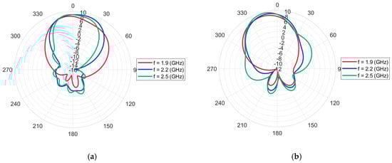Cross-pol radiation patterns calculated at the frequencies 1.9, 2.2, and 2.5 GHz respectively. (a) Radiation pattern on the , (b) .