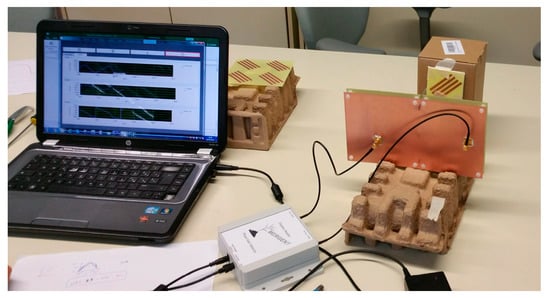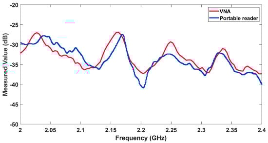 This section is dedicated to the experimental verification of the reader. In particular, the frequency response of the designed four-bit tags was measured in a non-anechoic environment at a distance of 20 cm. Calibration with the background was not necessary since the measured signal level was sufficiently higher than the antenna coupling. The maximum read range of this non-compensated measurement approach is directly related to the antenna coupling level which, for our antennas, was kept below −35 dB in all the analyzed frequency bands. The measurement setup is shown in Figure 9. In Figure 10, the spectral response measured with the reader is compared with the VNA connected to the readers’ antennas. The agreement between the curves is satisfactory as the portable reader is capable of detecting the four frequency peaks even if there are some small disagreements on the measured level of backscattered signals.