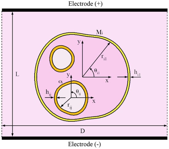 Actually, in most numerical computations, the cell is modeled as a medium of regular shape without any corner. To overcome such drawback, in the developed numerical modeling a realistic multicellular structures having irregular geometry have been investigated. In particular, it consists of p cells with an inner membrane system, which constitutes boundary membranes of various organelles such as nucleus, mitochondria, endoplasmic reticulum, etc. Figure 1 shows the detail of the generic i-th cell having the plasma membrane and q intracellular organelle membranes. The radius vector describing each membrane profile has been modeled by using the Gielis’ superformula [28,29,30] given by: