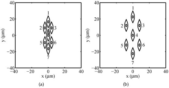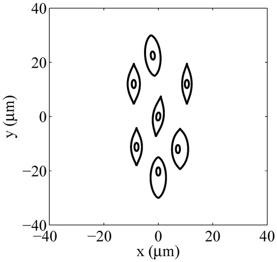 Each system is constituted by seven nucleated muscular-like cells ( and membranes. The smooth muscle cell has been chosen as it is nucleated. Moreover, its complex shape justifies the need to implement the Gielis’ superformula for a detailed geometrical modelling using a simple mathematical formulation. The shape of the plasma membrane has been modeled by using the superformula parameters , , , , and . As underlined in Section 2, the implementation of the superformula enables a broad capability to model the geometry of multicellular systems with different shaped plasma membranes and organelles. Such task can be realized by a suitable choice of the superformula parameters characterizing each membrane. Moreover, employing a series of superformulas with non-linear special functions [35] it may be possible to reproduce the borders of more complex shape as endoplasmatic reticulum. In the present study, a nucleus centered in the middle of each cell having a superellipse shape with semi-axis , has been implemented. Table 1 reports the Cartesian coordinates () of the center of each cell with respect to the origin for both the packed and the sparse systems.