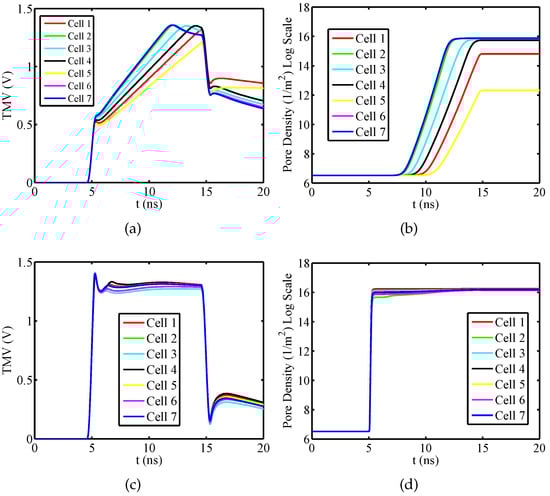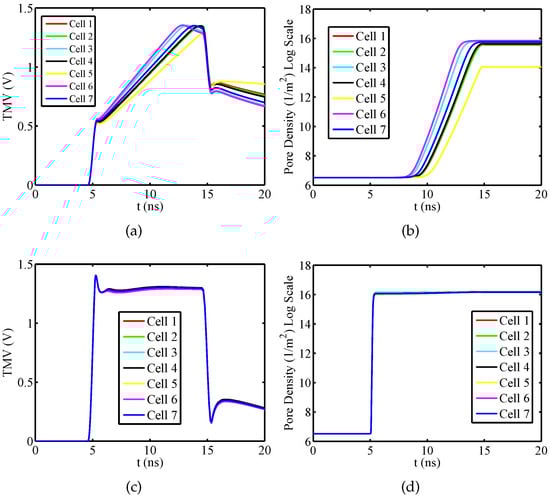Packed System—Temporal evolution of (a) TMV and (b) pore density for plasma membranes at the angular placement . Temporal evolution of (c) TMV and (d) pore density for nuclear membranes at the angular placement . Pulse amplitude and duration equal to and , respectively.
