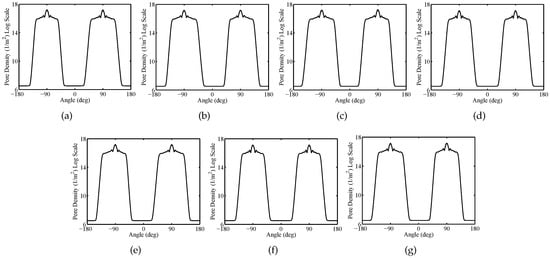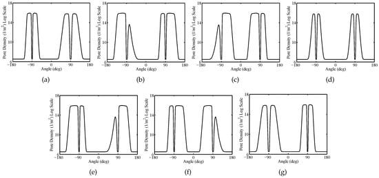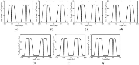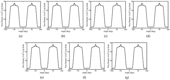 Packed System—Plasma membranes pore density versus the polar angle at time instant t = for (a) cell 1, (b) cell 2, (c) cell 3, (d) cell 4, (e) cell 5, (f) cell 6, (g) cell 7. Pulse amplitude and duration equal to and , respectively.