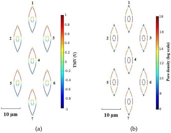 Packed System—(a) TMV and (b) pore density distribution on cell membranes at time instant t = . Pulse amplitude and duration equal to and , respectively.