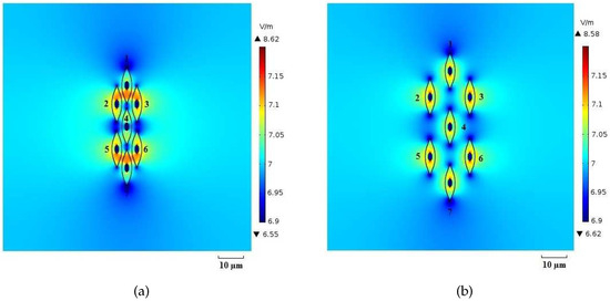 - Denzi, A.; Camera, F.; Merla, C.; Benassi, B.; Consales, C.; Paffi, A.; Apollonio, F.; Liberti, M. A microdosimetric study of electropulsation on multiple realistically shaped cells: Effect of neighbours. J. Membr. Biol. 2016, 249, 691–701. [Google Scholar] [CrossRef] [PubMed]