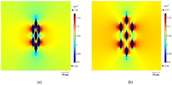 With reference to the sparse system, Figure 8 illustrates the temporal evolution of TMV and pore density at the angular placement for both plasma and nuclear membranes. Also in this case, the increase of TMV and the resulting activation of EP occur faster in the nuclear membranes. As it can be inferred by an inspection of Figure 8b, the time instant corresponding to the full electroporation of the plasma membrane depends on the cell placement and the activation sequence is cell 6, cell 3, cell 7, cell 4, cell 2, cell 1, cell 5. In contrast to the packed system, in the sparse one all the cells are electroporated. This occurrence can be explained by considering that both the electric field shielding and coupling are weakened. However, also in this case, the nuclear membranes are significantly electroporated at the same time instant.The spatial distribution of the TMV and pore density on cell membranes at time instant t = are reported in Figure 9. Moreover, Figure 10 and Figure 11 report the pore density versus the polar angle at time instant t = for the plasma and the nuclear membranes of each cell, respectively. Also in this case, the electroporation process takes place within the smoothed region of the plasma membranes but, respect to the packed system, a symmetric spatial distribution occurs. In fact, because of the lower density the interference due to neighboring cells is mitigated. In order to better justify such statement, in Figure 12 and Figure 13 have been reported the numerical results concerning the spatial distribution of the electric field and current density, respectively. The obtained numerical results highlight in the packed system the electric field and current flow are strongly affected by the neighboring cells.