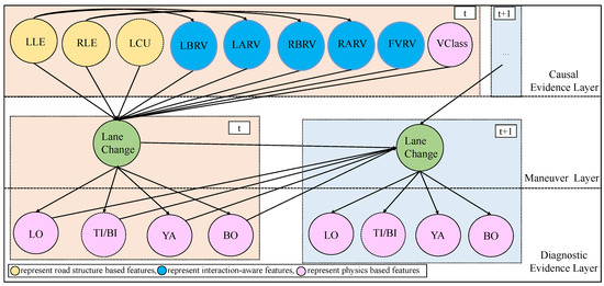 Inspired by [34], a three-layer structure is proposed, which institutes of a causal evidence layer, a maneuver layer, and a diagnostic evidence layer. We try to separate predictive features to make inter-causal reasoning instead of making either causal or evidential reasoning because of the basic causal assumption. The assumption of our model is that the driving maneuvers of surrounding vehicles are rational, and can be seen as an intermediate step in the driving process. The driving process can be modeled as follows. Initially, a driver evaluates the feasibility for executing specific maneuvers. The factors for the evaluation could be set in the causal evidence layer. If all conditions are satisfied, the driver will choose a proper driving maneuver to respond to changing environments. Next, the consequences caused by the maneuver will be produced in the form of measurable physical motion states. Thus, these consequences could be set in the diagnostic evidence layer. Finally, the physical motion states will furthermore influence the maneuver in the subsequent frame.