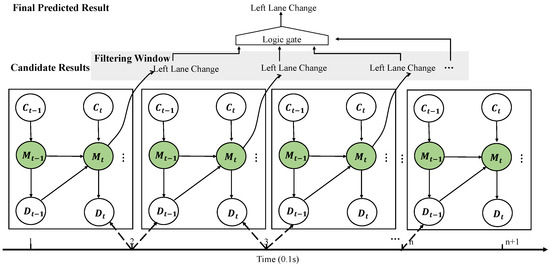 To improve the stability of the prediction, we exploit a window filtering algorithm after the Bayesian inference executed. The workflow of window filtering algorithm runs as Figure 6. Each time point, the DBN uses all features to infer the possibility of the maneuvers in two consecutive time slices (i.e., one previous time point and current time point). The maneuver at the current time point with a maximal possibility is chosen as the candidate result. Then, candidate results are put into a fixed-length row (also called filtering window). If all elements in the window are the same lane-change maneuver, the final predicted result will be the same. Otherwise, the final predicted result is lane keeping.