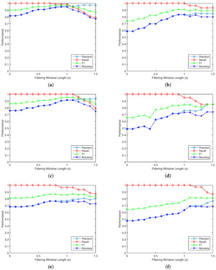 The results for two datasets are shown in Figure 7 and Figure 8, respectively. The figures demonstrate that the time length of the filtering window has important effects on the classification performance. The advantage of a larger filtering window is producing larger PRE and F1 scores in all datasets, which leads to less false alarming. Therefore, the prediction will be more stable. Contrarily, a smaller filtering window produces a larger recall rate in all datasets, which decreases the risk of ignoring the lane change. Consequently, the driving of intelligent vehicles will be more safe-oriented due to being careful to possible lane changes. The trade-off between the precision and recall is common in the field of machine learning. Thus, the time length of the filtering window should be chosen differently according to the traffic scenario. Please note that the number of left-change maneuvers is more than that of right-change maneuvers. Thus, the prediction performance of left-change maneuver is slightly better than that of right-change maneuver.