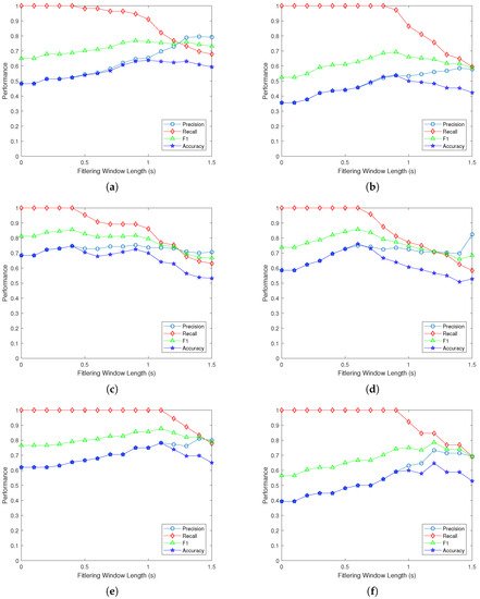 The impact of the time length of the filtering window on prediction performance in Dataset US-101. The left column shows the prediction performance of left lane changes, and the right column shows that of right lane changes. (a) Performance of left lane change in Dataset (IV); (b) Performance of right lane change in Dataset (IV); (c) Performance of left lane change in Dataset (V); (d) Performance of right lane change in Dataset (V); (e) Performance of left lane change in Dataset (VI); (f) Performance of right lane change in Dataset (VI).