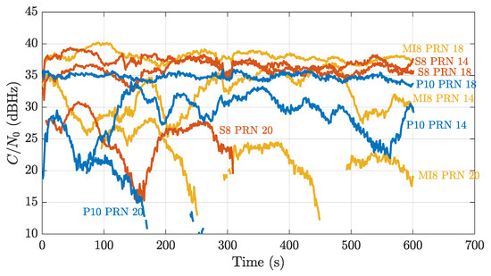 GNSS signal strength is commonly evaluated through , defined as the ratio between carrier power C and noise power density [12]. is a good indicator of the quality of the signal and of the hardware components of the receiver, such as the antenna [16]. The of three GPS satellites, common to all three devices, was observed: Pseudo Random Noise (PRN) number 18 with the highest elevation (), PRN number 20 with the lowest elevation (), and PRN number 14 at medium elevation (). Figure 2 displays the comparison between the as measured from the three different devices. The quality of the S8 and MI 8 devices is comparable, at least for the closer satellites, while the P10 device performed the worst in all cases. In the case of PRN 18, the three measurements differ by almost 5 dB. Furthermore, the S8 showed a more stable estimate. The MI 8, on the contrary, had the highest sensitivity, being able to gather measurements from a weaker signal, i.e., the farthest satellite, with more continuity and stability.