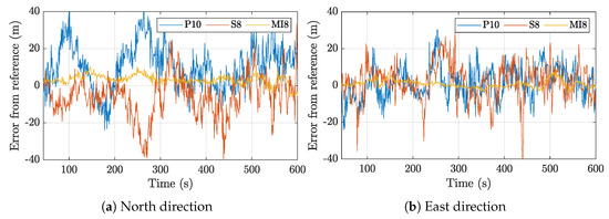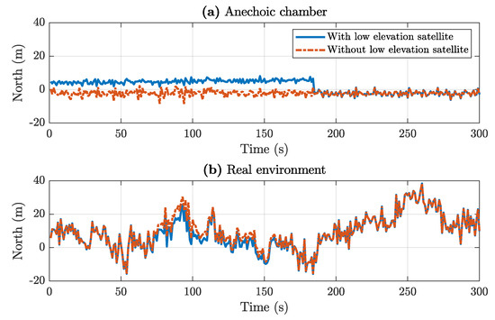 In the presence of this satellite, there was a shift mainly in the North component, as seen Figure 15a. Panel (b) depicts a similar low-elevation satellite scenario of real-environment measurements of P10, and it can be seen that, in general, such a minor shift should be drowned out in the noise.