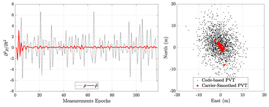 Code measurements are unambiguous but noisy; on the contrary, while carrier-phase measurements are much more precise but inherently ambiguous, and the process to solve for the integer ambiguity is non affordable by mass-market receivers [12]. An intermediate solution is based on the combination of code- and carrier-phase measurements through a process denoted carrier-smoothing filtering [18,19]. Let and be the code and carrier pseudorange, respectively. The smoothed pseudorange at epoch can then be defined by the following finite-difference equation: