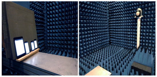The anechoic chamber of the Department of Electronics and Telecommunications (DET) of Politecnico di Torino has been used for the test. Different Android devices and the GNSS antenna transmitting simulated GNSS signals are clearly visible in the left pictures reported in Figure 6.