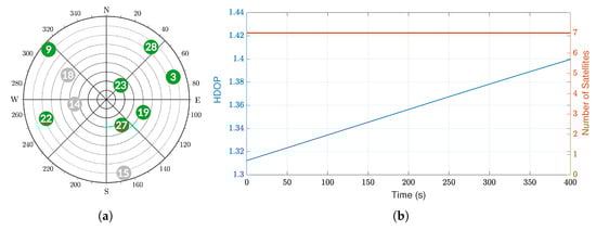 Simulated satellite constellations and related Horizontal Dilution Of Precision (HDOP) for record and replay experimental scenarios. (a) Skyplot of simulated satellites; (b) number of visible satellites and HDOP.