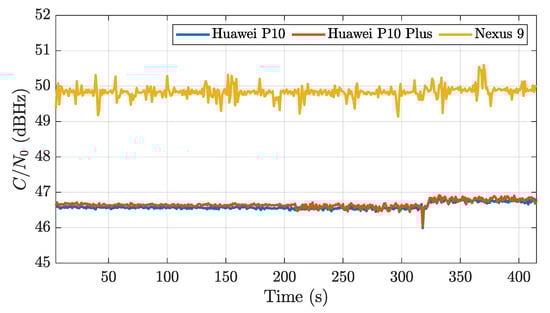 Satellite visibility in all the devices was comparable, and raw measurements of seven GPS L1 signals that were visible throughout the observation period were processed. As an example, Figure 9 plots the values of GPS PRN 3 for all Android devices being tested. A similar trend could be seen for all other visible PRNs. The of both Huawei models was more stable, with standard deviations (STDs) of around 0.08 dB with respect to the Nexus 9, with around 0.14 dB STD. Nevertheless, values were 3 dB lower than the latter. Interestingly, the Nexus 9 values were also a close match to the reference benchmark receiver. The cause of a slight spike in value around 320 s in the Huawei devices could not be determined, and could be due to a manufacturer setting.