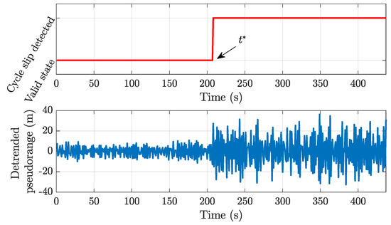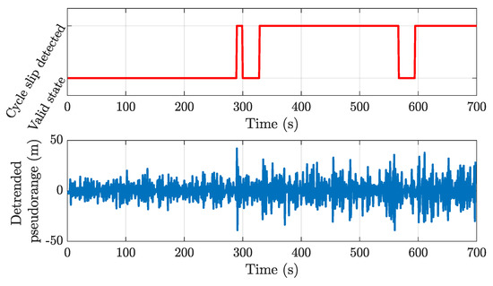 Replicating the detrending of pseudoranges to real-environment measurements shows the limits of quality assessment in such scenarios and, in turn, it justifies analysis in a controlled environment. Figure 16 reports the value of the AccumulatedDeltaRangeState flag (upper panel) and of the detrended pseudorange of GPS PRN 15 (lower panel). Even though, starting from epoch 300, cycle slips were detected, it was hard to make any conclusions about the quality of the pseudorange. This was due to the low quality of measurements under the effects of noise and other error sources, even when a close satellite with clear view from the receiver was selected. On the other hand, in the anechoic environment, it was clearly detected as the AccumulatedDeltaRangeState changed its state only when duty cycle was turned on (Figure 10).