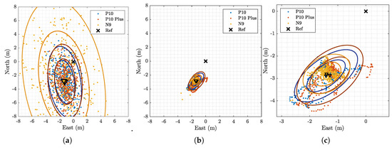 Comparison of the Position, Velocity, and Time (PVT) (Weighted Least-Squares) (WLS), as estimated by the three different devices, in a real environment. The true reference position is shown at the top, along with the average, the 1-, and the 2- ellipses for all the three smartphones.