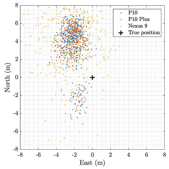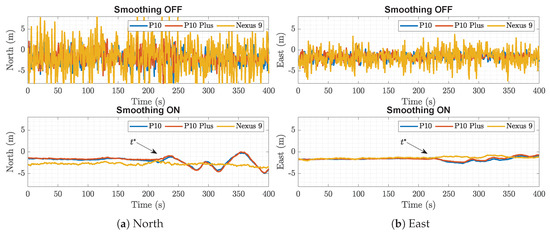 To explore further, Figure 12 was reported to see the solutions against time, and it is seen that there was an event around , after which the stability of the Huawei devices worsened. This coincided with the duty-cycle effect seen in the raw measurements, and the comparison of the raw measurements with the positions can be seen in Figure 13. From the figure, it can be established that this event was limited to the Huawei devices and not due to any instability of the signal coming in, as there was no seen effect on the or the Nexus 9 device. Table 3 details the error and precision before and after the event in the devices, and it has to be noted that the North direction was affected the most, as seen from the above figures as well. The big changes in mean and standard deviation of the Huawei devices were evident when compared to the Nexus 9.