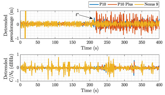 Figure 10 plots the detrended code pseudorange deviation (lower panel) compared with the AccumulatedDeltaRangeState parameter for GPS PRN 23 (upper panel). Such a flag indicates whether the range measurements is reset or there is a cycle slip due to a loss of lock [6]. The quality between the code and carrier pseudorangeswasis compared by calculating their detrended STDs. For short time spans, detrended pseudorange measurements could be considered as an ergodic process, and were obtained through second-order differentiation [7]. From the figure, it can be seen that there was a failure to achieve an ambiguity fix in the Huawei models after , but there were no cycle slips before this mark. The pseudorange noise remains within 2 m for all PRNs before a duty cycle occurred. In the Nexus 9, there were no cycle slips during the tested 10 min interval, and the noise remained within 4 m. This was observed in all other available PRNs. The continuity of a high-variability detrended pseudorange is due to the switching of clocks when a duty cycle occurs [6]. The detrended code- and carrier-phase pseudorange STDs of the Huawei devices before the power-saving function were within 3 m and 12 mm, respectively, whereas, for the Nexus 9, they were within 6 m and 13 mm. In comparison, the detrended benchmark receiver-code pseudorange STDs were within 1.5 m.