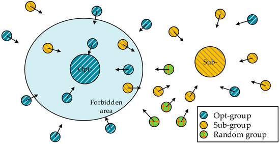 - In the first mixed group , if the maximum fitness value in the random subgroup is larger than the minimum fitness value in the Opt-group , exchange the two respective particles as follows:where the symbol means exchanging the two particles’ groups; is the particle number with the minimum fitness value in the Opt-group ; and is the particle number with the maximum fitness value in the random subgroup , as follows:Then, apply the same processing to the second mixed group, .Only one pair of particles are exchanged in each mixed group, the purpose of which is to maintain the relative independence of the Opt- and Sub-groups and to maintain the randomness of the random group.