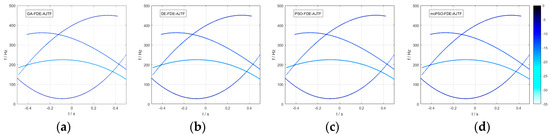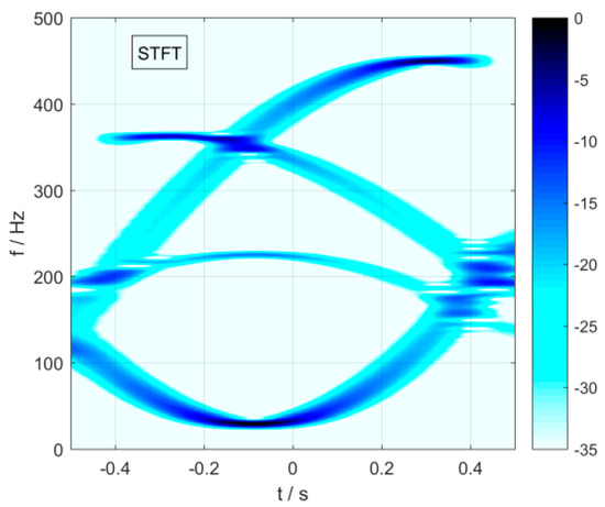 As shown in Figure 5, the general trend of the signal is obtained with low resolution by STFT, while in Figure 6, the four components were extracted by FDE–AJTF decomposition with higher resolutions. Furthermore, the four TFRs obtained by FDE–AJTF decomposition with different optimal algorithms are almost the same as each other, which indicates that the four TFRs correspond with the simulated signal generated as shown in Table 1, and all the four optimal algorithms can satisfy the requirement of FDE–AJTF decomposition for mc-PPS signal.