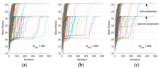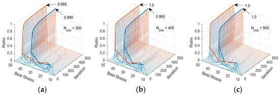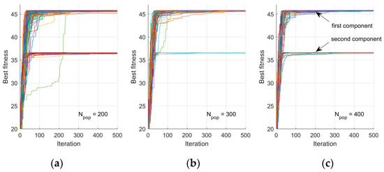 The best fitness change curves of mc-PSO with different numbers of individuals: (a) 300 individuals; (b) 400 individuals; and (c) 500 individuals.