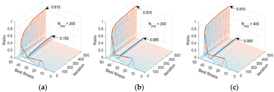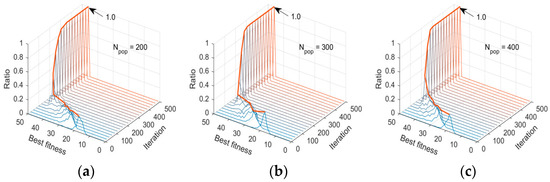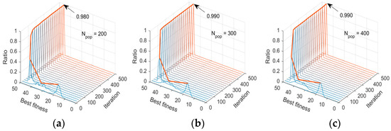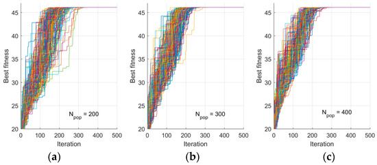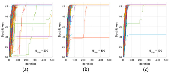 The best fitness change curves of GA with different numbers of individuals: (a) 200 individuals; (b) 300 individuals; and (c) 400 individuals.