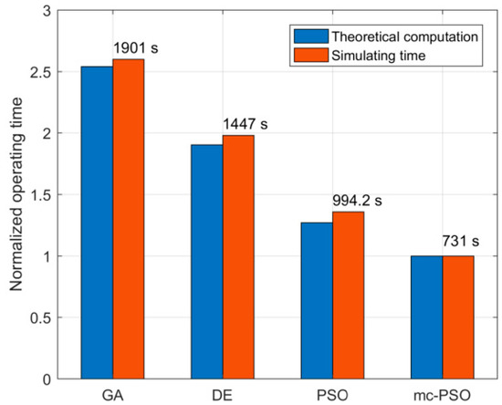 As shown in Table 4, the mc-PSO has the least fitness update times of the four algorithms, which corresponds to the normalized theoretical value in Figure 16, and the simulation time conforms to the theoretical value. It is evident that the mc-PSO has the lowest computational requirements and the shortest operation time, which confers about 30% improvement compared to the standard PSO algorithm.