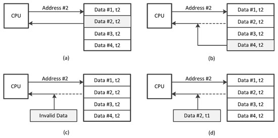 Figure 1 shows the threat model for the data in the embedded systems in the view of the embedded processor. (a) Presents the valid memory access operation to the data stored in memory with address #2 at time t2. The intention of this operation is to load the Data #2 to the CPU. (b) Shows the invalid operation of data splicing attack. The splicing attack involves the attacker intercepting a bus request and returning a valid but non-requested block. (c) Gives the invalid operation of data injection/spoofing attack. The adversaries modify the system data in the external memory with a random value or inject a portion of data. The stack smashing attack uses this method to inject malicious return address into the data section. (d) Demonstrates the operation of data reply attack. Time t1 is reached earlier than time t2. The attacker records the portion of the accessed data. Then, he intercepts a bus request and returns an outdated, potentially stale version of the requested data block. This type of attacks is not easy to be detected by data integrity verification.