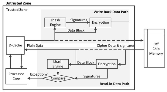 The data protection granularity is a trade-off between security and system performance overhead. In this security mechanism, on-chip data are signed and encrypted when they are evicted out, and the data are decrypted and verified after they are fetched from external memory and before they are used by the processor. Data transfer between external memory and processor occurs when the data cache misses. Consequently, the most suitable data block size is the cache line size of the lowest level data cache. Multiple caches transmit data in their self-organization in the trusted zone. Generally, we focus on the processor with only one level data cache and code cache for the rest of the paper. We take the cache line size as the size of the data protection unit, which guarantees security while simplifying the process of data protection. Data cache is located in the on-chip trusted area on which cached content is considered as immune to attack. When the data cache conflicts and writes back the data block to the external memory, the data block is attached with a signature that records its integrity information and is encrypted. When the data cache misses and fetches the data block from the external memory, the data block is decrypted, and its integrity is verified.