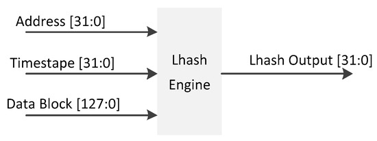 The implementation of the data integrity protection architecture adopts Lhash as the lightweight hash algorithm, which is used to sign and verify the data block stored in external memory. The hash algorithm is a kind of unidirectional compression algorithm, whose mechanism is to compress the information of any length into a fixed length output through a certain compression structure. We take a 32-bit scalar RISC processor with a Harvard micro architecture as an example to illustrate the process of signature generation. The cache line size is set as 128 bits. Thus, the granularity of the protection data block is 128 bits. Additionally, a 128 bits timestamp and 32 bits signatures are used in this work. The inputs and output of the Lhash Engine are shown in Figure 4.