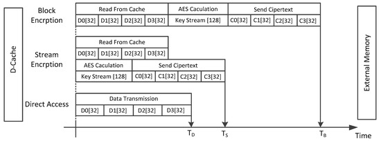 The processor memory access time diagram of a write-back operation from the data cache for these two methods is shown in Figure 5. In this figure, the write-back operation interval times for direct access without cryptographic security, OTP based stream encryption and block encryption are marked as a contrast. In the embedded system with a 32 bits RISC embedded processor mentioned in the last section, the data bus is 32 bits, and the data block is 128 bits. Block encryption requires the acquisition of a complete block of data before encryption and decryption. To complete the data block transmission on the bus, the data bus needs access the data cache four times to get a data block. Then, the AES encryption engine works to calculate the cipher before send to the external memory. The stream encryption process is parallel to the data stream transmission process. The security module with stream encryption mechanism calculates the key stream before transmitting the data block. Then, during the transmission of the data block, the data stream is encrypted by performing an XOR operation with the key stream. Compared with the two methods, the stream encryption method has less security delay.