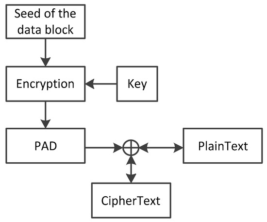 It is significant for the key stream to be random and unique. If the key stream has a high repetition rate, this is vulnerable even with the mechanism of encryption. It may potentially permit an attacker that doesn’t take much effort to guess the key stream. Besides, we have to make sure that the data at different locations in the external memory has different seeds. For this reason, we use the physical address of the data block as part of the seed to ensure the spatial uniqueness of the key stream. In addition, for a specific address, the data written each time is required to correspond to a different seed. Therefore, we require that the seed contain time information to ensure the time uniqueness of the key stream. We use the counter and timestamp mentioned in the integrity protection as a part of the seeds. The procedure of the OTP stream encryption and decryption is shown in Figure 6.