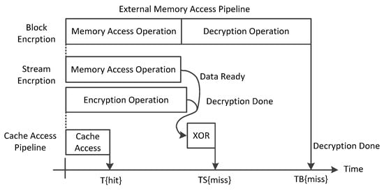 where C is the cipher, P is the plaintext data value, and AESKEY(seed) is the key stream having the same bit width with P. This implementation structure can save more performance loss at a load operation. It can be inferred from Figure 7. When the processor tries to load data in case of data cache miss, the physical address of the target data will be asserted at first. Then, the memory controller is authorized to load the encrypted data from external memory. The seed for the AES engine is fixed at the same time. Thus, the AES engine to calculate the pad and the memory access operation can be synchronized. After the two operations are completed, only one delay of the XOR operation is required, and the external data can finish the load and decryption.