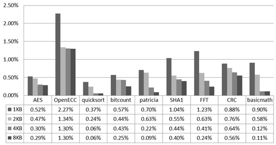 The average performance overhead across the selected benchmarks is 0.94%, ranging from 0.37% (quicksort) to 2.27% (OpenECC). In embedded systems, the main performance overhead is caused by the response of the external device. The memory access response accounts for the vast majority. The CPI can reflect the proportion of the memory access instruction in the binary code. The more memory access instructions in a benchmark, the higher the CPI will be. For the benchmarks such as AES, OpenECC, Sha1, FFT, and basicmath, which require a large number of memory access operations to store temporary data, the CPIs are higher than other benchmarks. In most of the benchmarks, the higher CPI means the higher performance overhead of the proposed security mechanism. This is because once the data cache misses, the append security preserving hardware may incur additional clock cycles. The AES benchmark is an exception, because of the higher data cache write and load hit rate. The processor can increase the size of the cache to reduce the miss rate. This can help the proposed work to decrease the performance overhead. Figure 10 shows the performance overhead of the selected benchmarks with 4 KB instruction cache and 1/2/4/8 KB data cache. In the embedded system configured with 8 KB processor data cache, the performance overhead of this work ranges from 0.06% to 1.30%. The proposed design has a small impact on the performance of the embedded system.