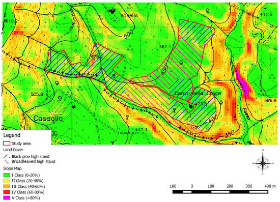 The study area is located in Piegaro district in the Province of Perugia, within a State property managed by the Regional Forest Agency (AFoR). The total area of the study area is 20.02 ha, 12 ha characterised by the presence of a Pinus nigra Arn. high stand and 8 ha of high stands of Quercus pubescens Willd., Quercus cerris L. and Fraxinus ornus L. descending from old coppice conversion (Figure 1). This classification was taken from the Forest Management Plan of the property.