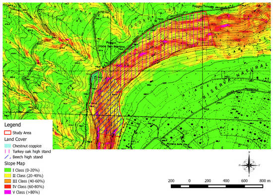 Road density in San Martino al Cimino amounted to 54 m ha−1 and all the roads were classified as skid trails (Table 2 and Figure 4a). In total, 3300 m of forest roads were present with an average width of 3.5 m and average slope of 12% (Table 2).