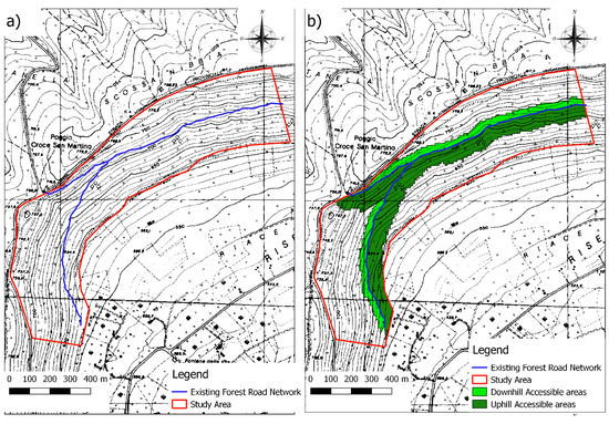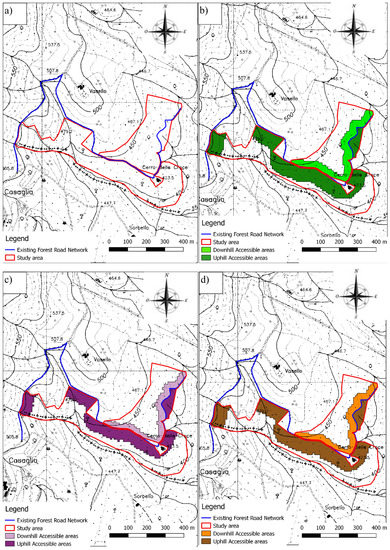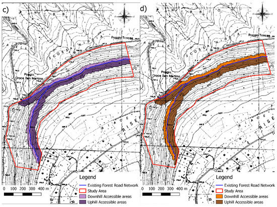 Laschi et al. [6] proposed a classification into accessible, barely accessible and inaccessible areas of a forest estate in Northern Italy. This classification was based upon the concept of “access time”, that is, the time required for a forest worker to make a round trip on foot from the nearest road to a given point in the forest.