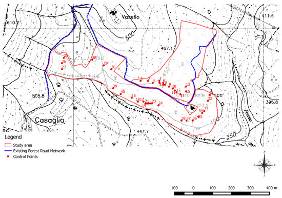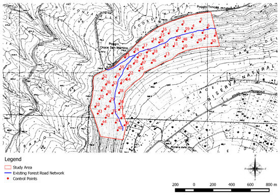 The field test in San Martino al Cimino was carried out on 58 control points (Figure 8). The shortest distances between each point and the skid trail were measured and the results were compared with those distances obtained using the GIS methods (Table 4).