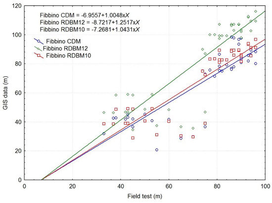 Scatterplot of distances measured in Fibbino study area: field test vs. CDM: R2 = 0.7193, R = 0.8481, p < 0.001; field test vs. RDBM12: R2 = 0.7583, R = 0.8708, p ≤ 0.001; field test vs. RDBM10: R2 = 0.7583, R = 0.8708, p < 0.001.