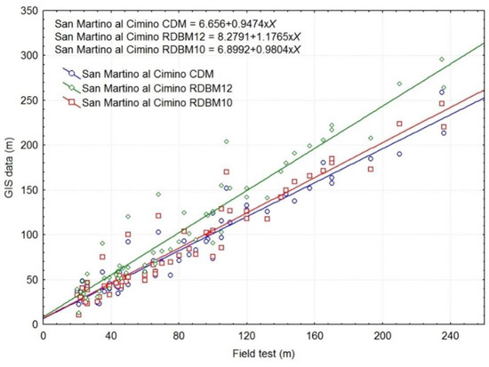 The scatterplot analysis (Figure 6) showed high values of R for the three GIS methods and the equations showed a similar constant error for the three methods (ranging from 6.9 to 8.7) and a different level of variable errors. In particular, for the two GIS methods, CDM and RDBM10, the variable error was close to 1.0 (almost negligible), while it was somewhat greater for the RDBM12 (ca. 1.3).