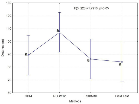From the statistical analysis, there were no significant differences between RBDM10, CDM and the field test measurements (Figure 7). RBDM10 gave the closest distance values to those obtained in the field (Figure 7). Only RDBM12 was different (statistically significant and with an overestimation of the distance value) from CDM, RDBM10 and the field test (Figure 7).